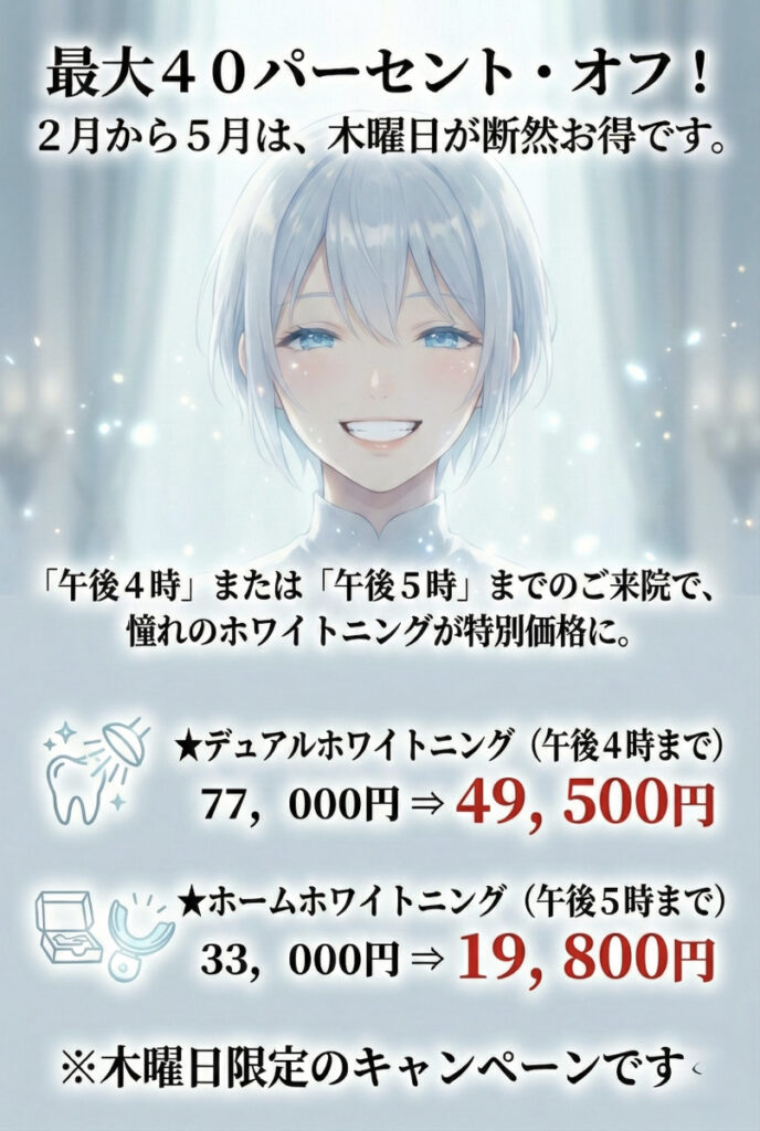 2月〜5月限定で、木曜日、早めの時間にご来院できる方だけの特別価格をご用意しました